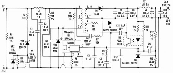 整個電源效率為78%,這樣1個簡單的反激電源能提供3.3V(2A)。對大多數(shù)應(yīng)用來講,低成本和簡單化是最重要的特性。假若采用同步整流正激轉(zhuǎn)換器拓?fù)浜途哂休^低通導(dǎo)功耗、較高功率的器件DPA424G,則電路效率可增加5%~10%。
