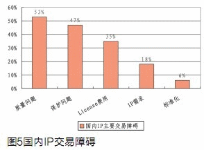 根據(jù)我們對92家芯片設計企業(yè)的問卷調(diào)查,IP質(zhì)量、IP保護和IP費用是目前國內(nèi)IP核交易中的主要障礙。(見圖5)
