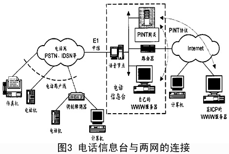 ---- 由 于PINT 業(yè) 務(wù) 主 要 是 以WWW 方 式 實 現(xiàn) 的, 因 此 電 話 信 息 臺 就 應(yīng) 與ICP 合 作, 如 圖3, 在 兩 者 之 間 以 一 種 標 準 的 協(xié) 議 交 換 信 令 和 承 載 數(shù) 據(jù),PINT 協(xié) 議 正 是 一 種 很 合 適 的 協(xié) 議。 為 了 實 現(xiàn) 點 擊 撥 號、 點 擊 發(fā) 送 傳 真 等 業(yè) 務(wù), 需 要 在WWW 服 務(wù) 器 的 頁 面 上 嵌 入 激 活 這 些 業(yè) 務(wù) 的 鏈 接 項, 鏈 接 項 對 應(yīng) 的 后 臺 程 序 是 一 個PINT 客 戶 端 程 序(PINT Client),PINT 網(wǎng) 關(guān) 中 也 具 有PINT Client 的 功 能。PINT Client 包 含 了UAC 和UAS 的 功 能。 在 這 類 業(yè) 務(wù) 的 推 廣 初 期, 由 于PINT 網(wǎng) 關(guān) 較 少, 作 為WWW 服 務(wù) 器 后 臺 程 序 的PINT Client 可 直 接 與PINT 網(wǎng) 關(guān) 交 互。 當 業(yè) 務(wù) 使 用 規(guī) 模 進 一 步 擴 大 后 就 需 要 在Internet 中 設(shè) 置PINT Server, 各PINT Client 借 助 于 這 些PINT Server 來 找 到 一 個 合 適 的PINT 網(wǎng) 關(guān)。 如 果 電 話 信 息 臺 自 身 提 供 了ICP 的 功 能, 那 么 在 信 息 臺 內(nèi) 部 的 局 域 網(wǎng) 上 就 可 以 方 便 地 實 現(xiàn) 業(yè) 務(wù)。