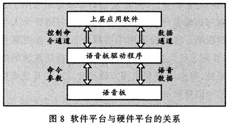 ——為便于在Windows95環(huán)境下使用該平臺,開發(fā)了虛擬設(shè)備驅(qū)動程序。該程序為上層軟件提供了豐富的接口函數(shù),用于實現(xiàn)對語音板的操作。軟件平臺與硬件平臺的關(guān)系如圖8所示。