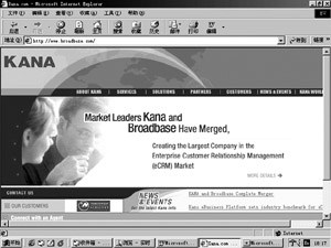 Kana是美國在線服務(wù)領(lǐng)域的知名公司,其eCRM軟件在客戶關(guān)系管理領(lǐng)域極具代表性。Kana公司剛開始只提供電子郵件響應(yīng)管理技術(shù),但是通過一系列的收購舉措,Kana已經(jīng)可以提供端到端的客戶服務(wù)解決方案。最近,Kana并購了美國Broadbase公司,成為在線客戶服務(wù)領(lǐng)域的“巨頭”。該公司的旗艦級(jí)產(chǎn)品主要是針對(duì)Email回復(fù)的客戶服務(wù)系統(tǒng),Kana的Email客戶服務(wù)軟件被Yahoo!和AOL等著名的網(wǎng)絡(luò)公司采用。