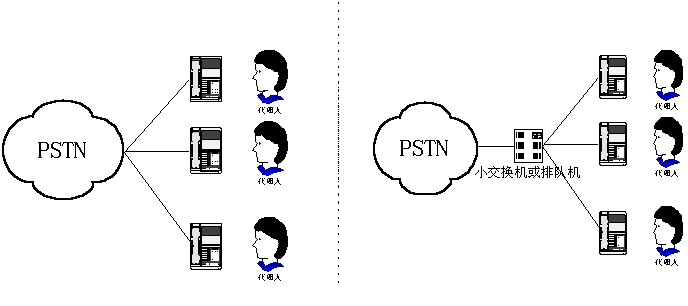呼叫中心,早期是指一個由兩人或更多人組成的、在一個特定地方用專用設(shè)備處理電話業(yè)務(wù)的小組。這些人就是通常所說的呼叫中心代理(人)。一個呼叫中心可以只提供信息接收服務(wù),或者只提供信息發(fā)送服務(wù),或者是一個混合式呼叫中心,其呼叫中心代理會負責所有這兩項工作。從物理設(shè)備構(gòu)成來看,第一代呼叫中心可用下圖(1)、(2)表示。