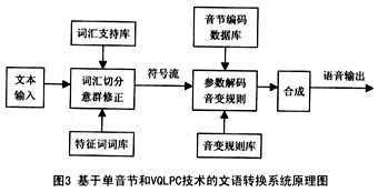 ----一 種 典 型 的 基 于 單 音 節(jié) 和VQLPC( 矢 量 量 化 的LPC) 技 術 的 文 語 轉 換 系 統(tǒng) 原 理 圖 如 圖3 所 示。