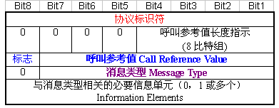 其中的協(xié)議標(biāo)識(shí)符指示消息的參考協(xié)議類(lèi)型,比如I.451消息的協(xié)議標(biāo)識(shí)符為"00001000";呼叫參考值用于指示消息所控制的B信道上哪一呼叫,該值由發(fā)起呼叫的一側(cè)進(jìn)行分配,且和某一特定呼叫相關(guān)的所有消息都附帶了這個(gè)值。
