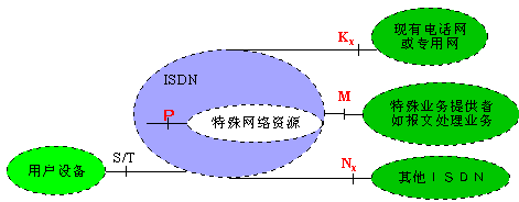 從現(xiàn)有的通信網(wǎng)過渡到未來的ISDN網(wǎng),是長期的過程,這就必然存在ISDN網(wǎng)和現(xiàn)有通信網(wǎng)的互通問題。除了用戶設(shè)備接入ISDN的S/T參考點,ISDN定義了四個附加參考點用于網(wǎng)絡(luò)互聯(lián)。見下圖。