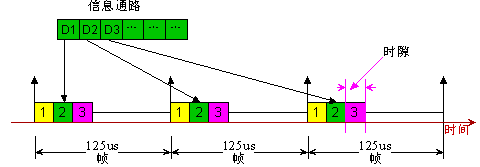 TDM就是時分復用模式。它把若干不同通道(Channel)的數據按照固定位置分配時隙(TimeSlot:8Bit數據)合在一定速率的通路(Path)上。每一個時隙的速率為一個標準的PCM(Pulse-Code-Modulation)話路64Kbps。每通道時隙的重復頻率為Ts=8KHz,即幀周期為125us。如圖2所示。通常把若干通話復用在一起以后的通路組稱為一個基本群路,然后更大的通路均在此基礎上進一步復用(4倍)為高次群。其中的時隙數即復用的通道數與時鐘有關。國際上有兩個不同的基群標準(PRI:Primary Rate Interface)。美國和日本采用24支路標準,我國采用歐洲標準,使用32路標準,分別記為: