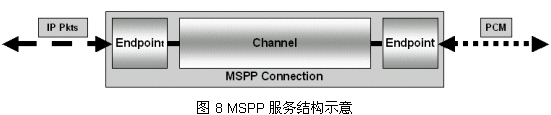 MSPP運(yùn)行在FusionTM環(huán)境下,意即Media Stream Processing Protocol,媒體流處理協(xié)議,它為各種業(yè)務(wù)間的數(shù)據(jù)轉(zhuǎn)換/交互提供了一種可能。它相當(dāng)于一個(gè)中間代理(Agent),通過標(biāo)準(zhǔn)的入口/出口終結(jié)點(diǎn)(Entry and Exit Endpoint)和端到端連接(End-End Connection)完成異種網(wǎng)絡(luò)間的格式化數(shù)據(jù)(Formatted Data)傳遞功能,見圖8。MSPP包含兩個(gè)基本組件:終結(jié)點(diǎn)(Endpoint)和通道(Channel),異種網(wǎng)絡(luò)間通過這兩種組件構(gòu)成的連接(Connection)完成。
