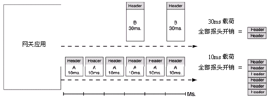 在一個減少發(fā)話方和受話方間音頻反應時間的努力中,VoIP網(wǎng)關通常會配置成發(fā)送較小的語音數(shù)據(jù)載荷。雖然這樣做通?梢詼p少聽得見的傳輸延遲,但同時也增加了一個給定語音數(shù)據(jù)流需要傳遞的包的數(shù)量。因為不管多小的音頻載荷都需要一個固定大小的包報頭,網(wǎng)上需要傳遞的數(shù)據(jù)量越大這個效果越明顯──跟隨的是網(wǎng)絡包和數(shù)據(jù)流量的相應增長。圖1說明了用于傳輸包報頭的帶寬會隨著包載荷大小的縮小而增大。