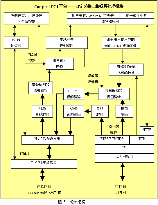 圖3所示為網(wǎng)關(guān)重要組成的分解圖。網(wǎng)關(guān)機(jī)箱很可能是一個(gè)Compact PCI機(jī)箱,機(jī)箱中包含了作為網(wǎng)絡(luò)中一個(gè)節(jié)點(diǎn)的所有組件;镜囊曨l呼叫和瀏覽器應(yīng)用可以運(yùn)行在主處理器上,但T1或E1接口需要由附加模塊來(lái)支持。為了支持大量的端口,還需要附加的以太網(wǎng)接口和自定義的視頻處理模塊。T1/E1接口通過(guò)公共電話網(wǎng)接入無(wú)線交換中心,也可以直接接入到無(wú)線交換中心。以太網(wǎng)接口會(huì)通過(guò)標(biāo)準(zhǔn)IP路由器接入到因特網(wǎng)。