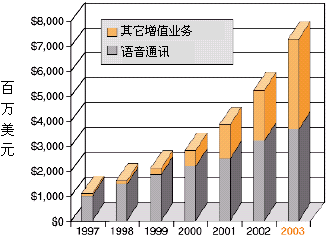 為了獲得競爭優(yōu)勢,業(yè)務(wù)提供商──傳統(tǒng)長途運營和本地交換運營商,因特網(wǎng)業(yè)務(wù)提供商(ISP),應(yīng)用業(yè)務(wù)提供商,以及無線運營商──都在想方設(shè)法發(fā)布基于IP的業(yè)務(wù),這些業(yè)務(wù)應(yīng)該:對用戶有較高的價值,能縮短面市所需時間,部署是低成本高效益的。向用戶提供高價值的增值業(yè)務(wù)能為業(yè)務(wù)提供商帶來重要的收入源泉,并使他們更有特色,增加市場分額,特別是如果這些業(yè)務(wù)以快速、易于支持的方式部署,以上這些優(yōu)勢就會更加突出。據(jù)估計,到2003年增值業(yè)務(wù)設(shè)備僅在美國就能達(dá)到73億美元的市場,正如圖1所示。