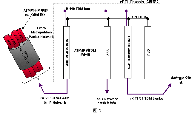 圖5是NMS公司的VoATM典型網(wǎng)關(guān)結(jié)構(gòu)。