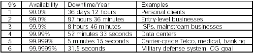 正如表中建議的那樣,實用性尤其在非常接近1的區(qū)間內才被討論。盡管99%的正常運行時間看起來很好,它仍然將導致每年超過3天半的故障時間。大部分方案不會被認為是高可用的,直到它們接近99.9%的運行時間--大概每年9個小時的故障時間。但是,通信行業(yè)使用4個9級別到5個9級別范圍的實用性。