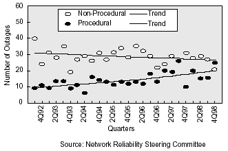 根據(jù)來自網(wǎng)絡可靠性指導委員會(NRSC)的研究,對于33%報告的業(yè)務中斷,程序出錯是根本原因。程序中斷的頻率有上升的趨勢,正如在右面圖中顯示的那樣。