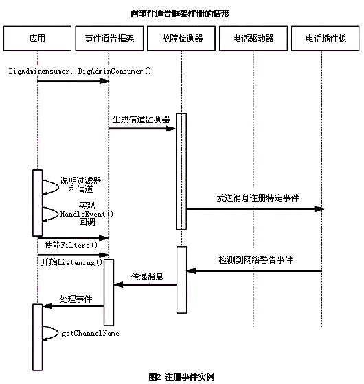 。。系統(tǒng)版包括事件服務(wù)API和事件通告框架。這些API用來向事件通告框架注冊(cè)你的應(yīng)用。框架是使所有操作、管理、維護(hù)和定制服務(wù)(OAM&P)向已注冊(cè)的電話應(yīng)用發(fā)送異步消息的子系統(tǒng)。關(guān)于事件服務(wù)API和事件通告框架的詳細(xì)信息,可以參考系統(tǒng)版文檔中的編程指南。框架含有不同信道,這些信道用來報(bào)告與操作人員的一些被動(dòng)或者主動(dòng)的動(dòng)作相關(guān)的事件。