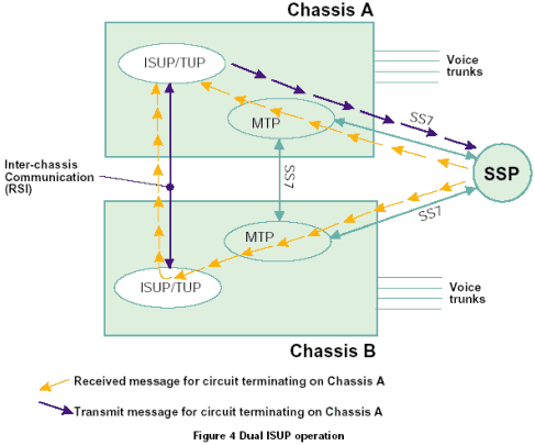 一個(gè)雙ISUP/TUP系統(tǒng)通過激活每個(gè)機(jī)箱中的一半電路協(xié)議狀態(tài)機(jī)進(jìn)行工作。每個(gè)ISUP/TUP層通過本地MTP3發(fā)送所有的傳送業(yè)務(wù)。本地MTP3采用與相鄰SS7節(jié)點(diǎn)之間的本地鏈路進(jìn)行傳輸,如果該鏈路發(fā)生故障,采用機(jī)箱之間的SS7連接。